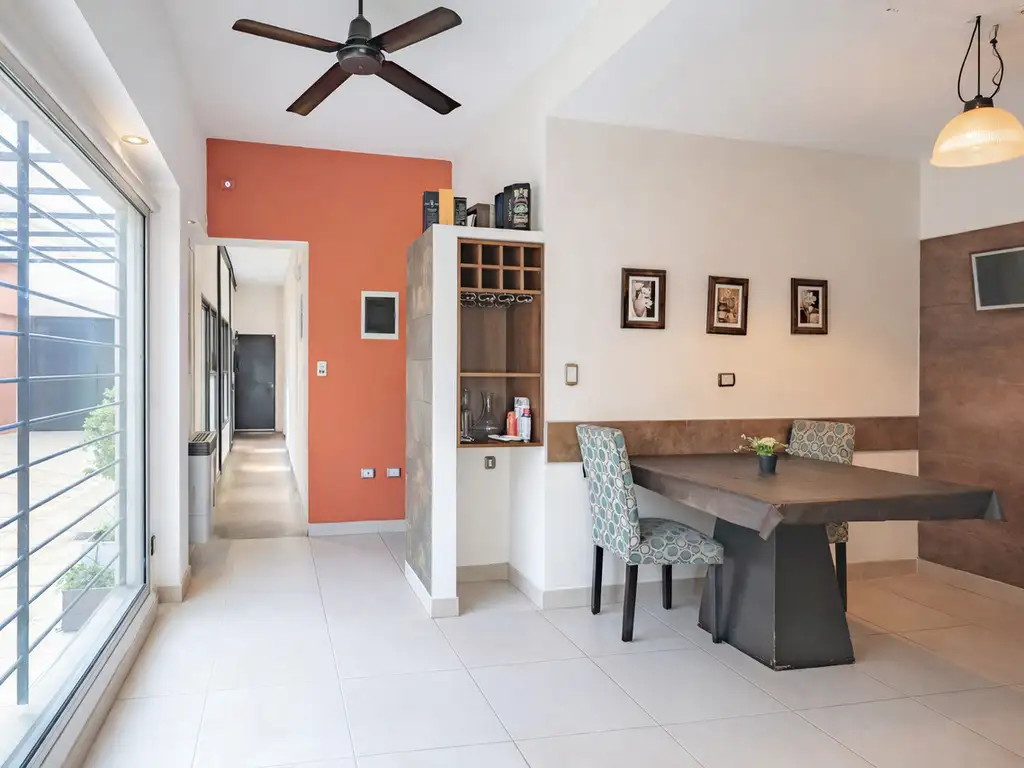 La fachada, de líneas modernas y sin retiro municipal, aporta un estilo minimalista y sobrio. Al ingresar, un pasillo interior organiza el acceso a los diferentes espacios de la planta baja: amplio living-comedor, cocina con comedor diario y uno de los dos baños completos de la vivienda (equipado con bañera).