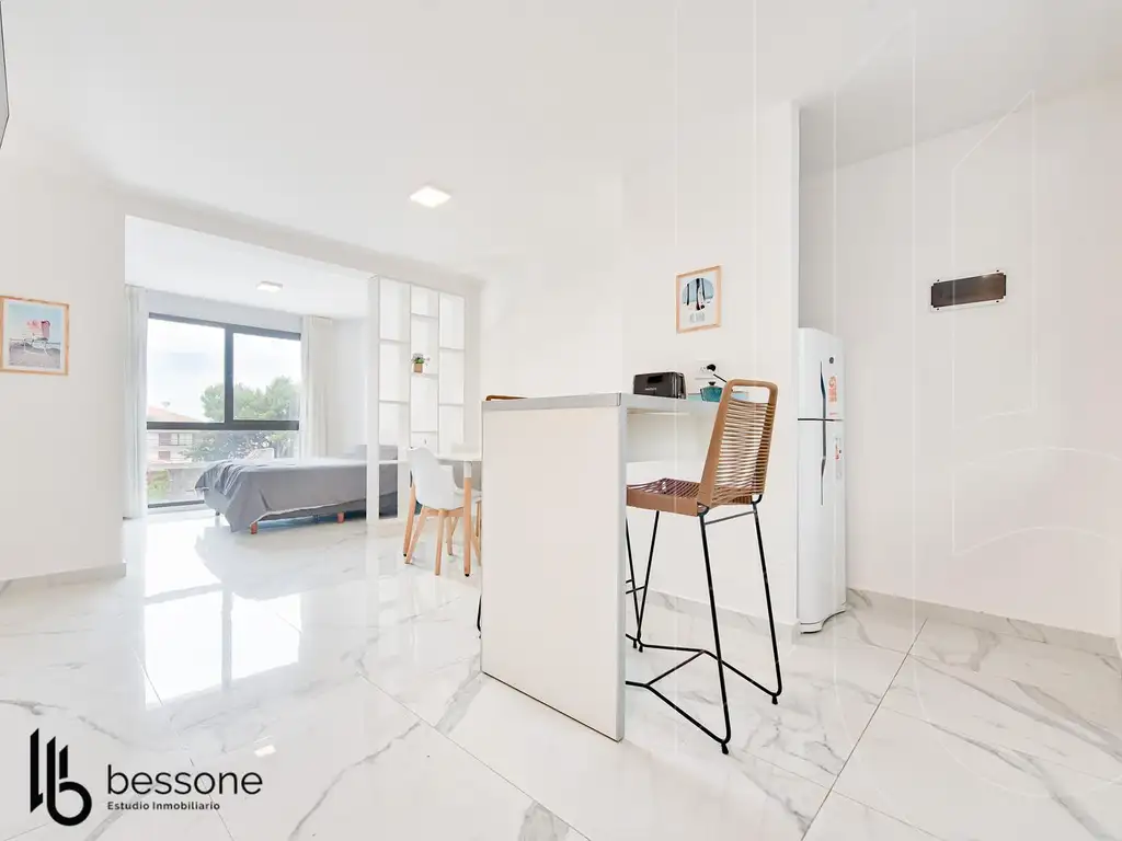 Monoambiente luminoso ubicado a pasos de las playas de Punta Mogotes, ideal para disfrutar de la costa. La unidad cuenta con un ambiente amplio con pisos de porcelanato, cielorraso de durlock y balcón francés con aberturas de aluminio y doble vidrio laminado. La cocina está equipada con mesada de granito, bajo mesada a medida y conexiones para lavarropas, Split y televisión. El baño es completo, con sanitarios y griferías de primera calidad, revestimientos cerámicos de piso a techo y ventilación por extractor.