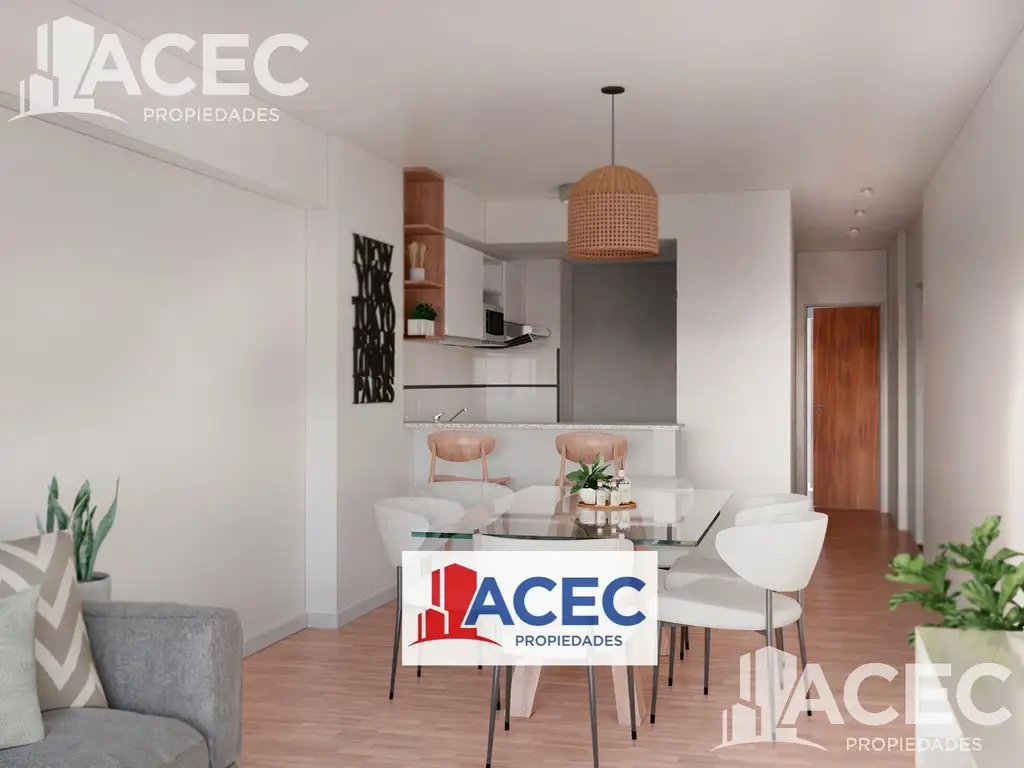 Ambiente único donde se desarrolla el espacio uso de living - comedor con cocina semi -integrada con barra desayunador, totalmente amoblada y equipada