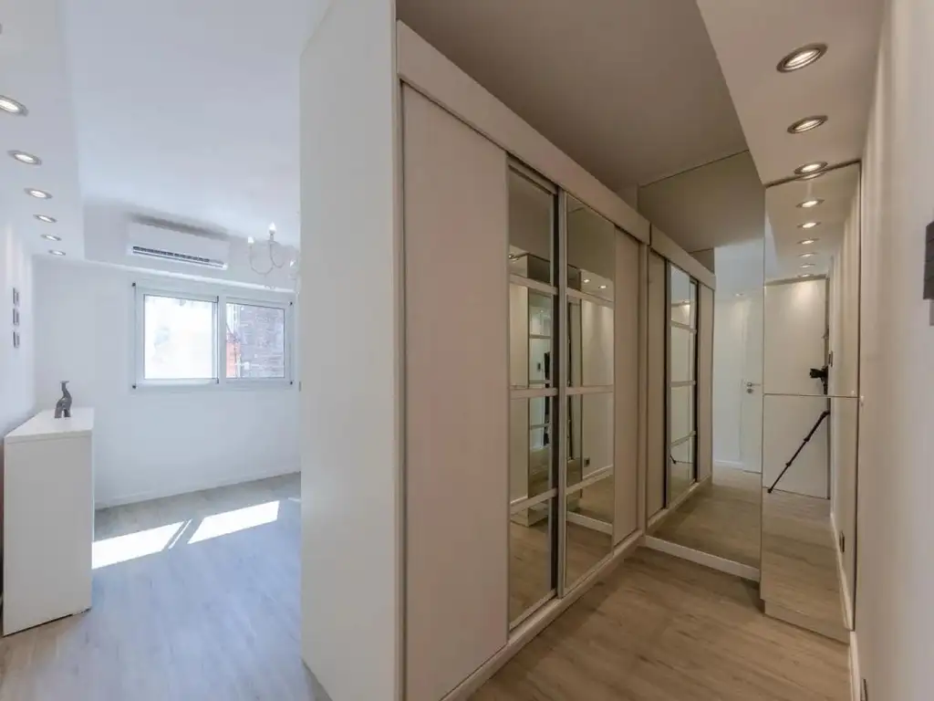 Primer dormitorio: pisos flotantes LVT, sistema Click color gris. Aire acondicionado frío/calor inverter, persianas eléctricas. Espejo en una de sus paredes, placard con interiores terminados. Araña con caireles. Pared revista para respaldo cama, con empapelado y luz LED.