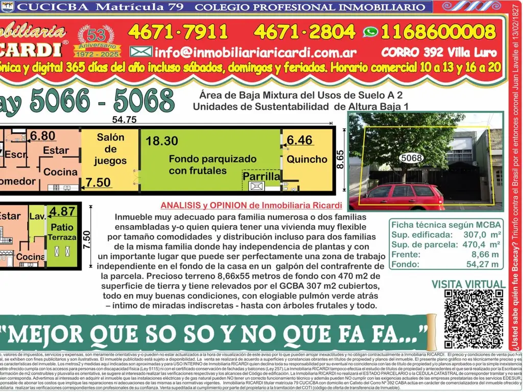 Precioso terreno 8,66x55 metros de fondo con 470 m2 de superficie de tierra y tiene relevados por el GCBA nada más ni nada menos que 307 metros2 cubiertos todo en muy buenas condiciones, con elogiable pulmón verde atrás íntimo de miradas indiscretas - hasta con árboles frutales y todo.
