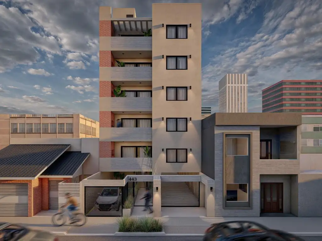 Edificio de estilo con aberturas DVH en negro, con hormigón visto en techos y espacios comunes , revestido en su fachada con ladrillos a la vista.