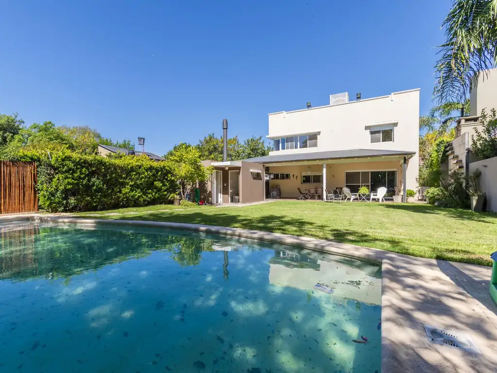 Su exterior se compone de una amplia galería que rodea la casa con espacio para dos autos, parrilla con cerramiento y bacha. Cuarto de guardado o deposito con caldera para el agua de la pileta (de 3,5 x 8 metros, climatizada). Portón vehicular eléctrico.