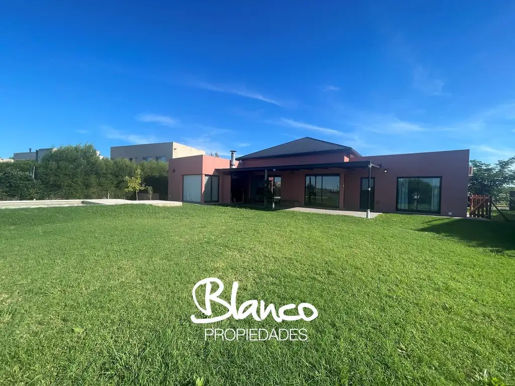 Exterior: Galería grande con parrilla y amplio jardín. Importante pileta de natación (9x4m) con borde infinito, playa húmeda, sistema de luces, filtrado y bombeo subterráneo. Costa a la laguna, playa de 16mts de frente con muelle propio. Espacio descubierto para guardado de dos autos.