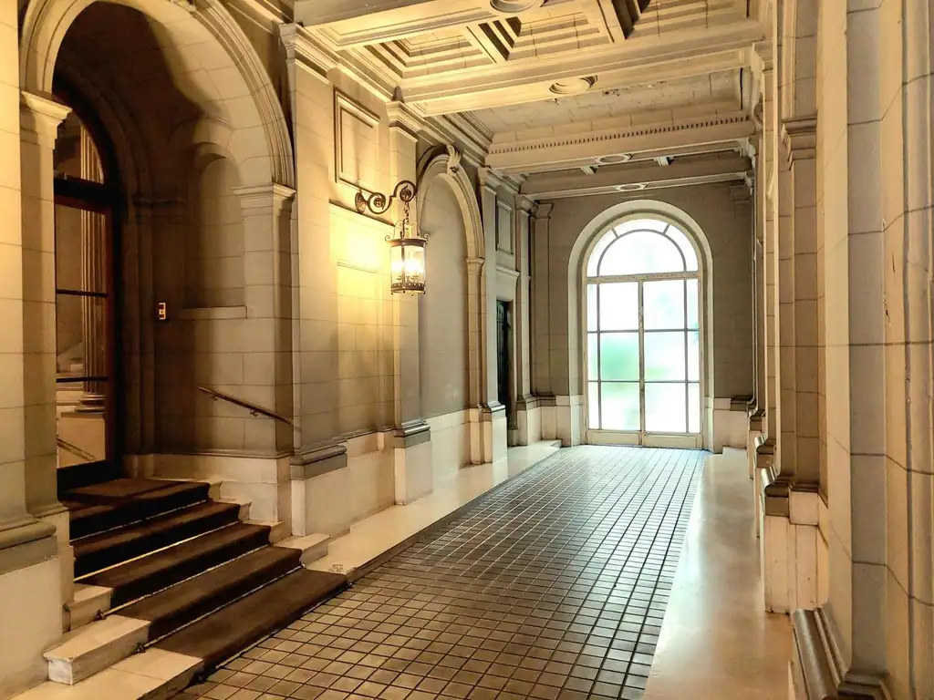 Destaca sobremanera la nobleza expuesta en su calidad espacial, tanto en su ingreso desde la vía pública (mediante un extenso "decent á couvert" pasante), como de un imponente lobby de acceso principal al edificio.
