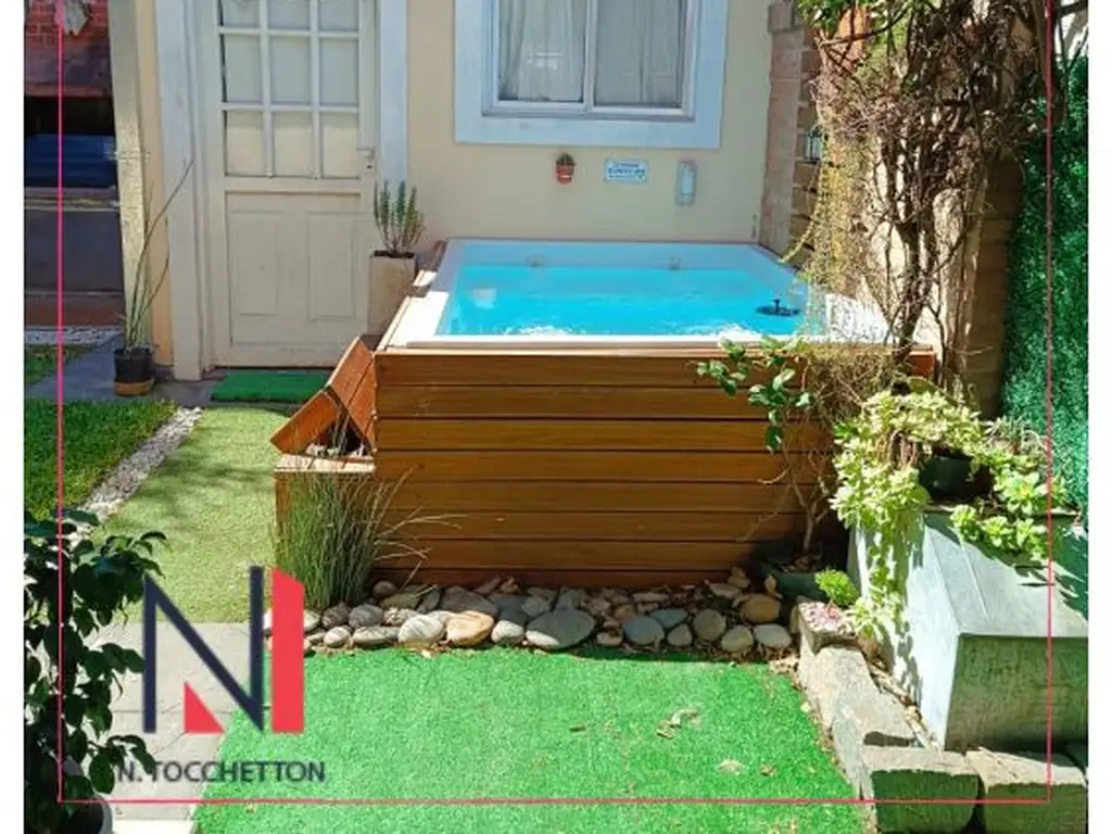 El exterior ofrece : un jardín con parrilla, cuarto de guardado, horno de barro y una piscina pequeña, equipada con motor para disfrutá de tardes al aire libre en un espacio con confort, además posse riego por aspersión. Posee tres cocheras, dos de las cuales son cubiertas, que se convierten en un quincho y otra descubierta