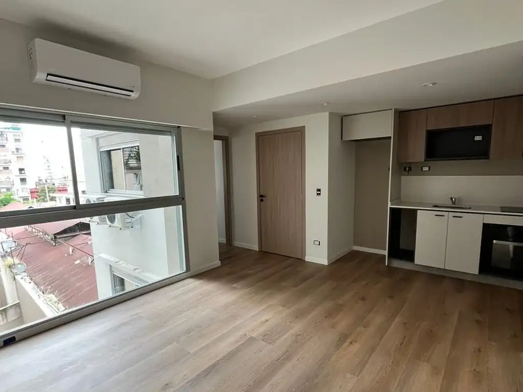 Amplio livingcomedor con cocina eléctrica integrada, equipada con anafe y horno, muebles de cocina de primera calidad (alacenas y bajo mesada) y ventana lateral que aporta luz y ventilación natural.