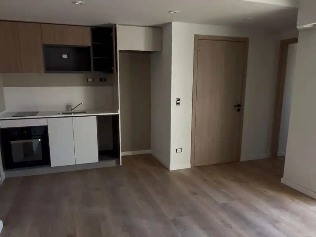 Amplio livingcomedor con cocina eléctrica integrada, equipada con anafe y horno, muebles de cocina de primera calidad (alacenas y bajo mesada) y ventana lateral que aporta luz y ventilación natural.