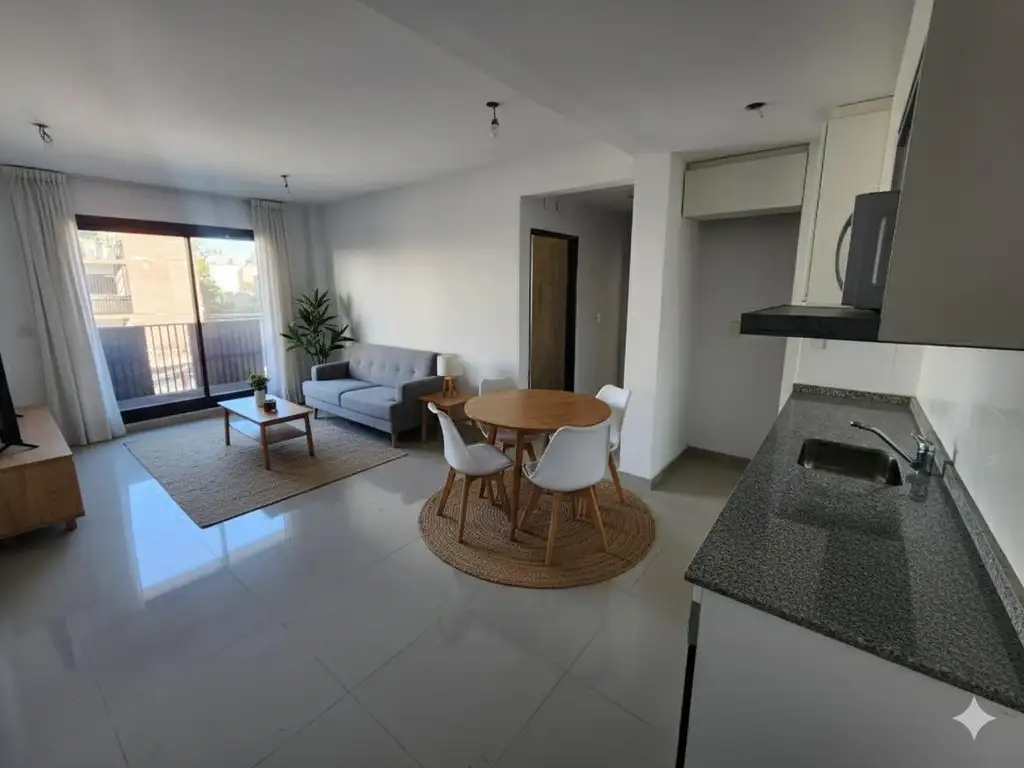 Este moderno departamento de 3 ambientes cuenta con una distribución funcional y espacios luminosos. El ambiente principal está compuesto por un living comedor con cocina integrada con horno y cocina eléctrica. Dispone de dos habitaciones, una de ellas cuenta con placard incorporado y baño privado.. La segunda habitación, también con placard. Ambas habitaciones ofrecen un espacio cómodo y funcional. El departamento también tiene un baño completo. Los pisos son de porcelanato.