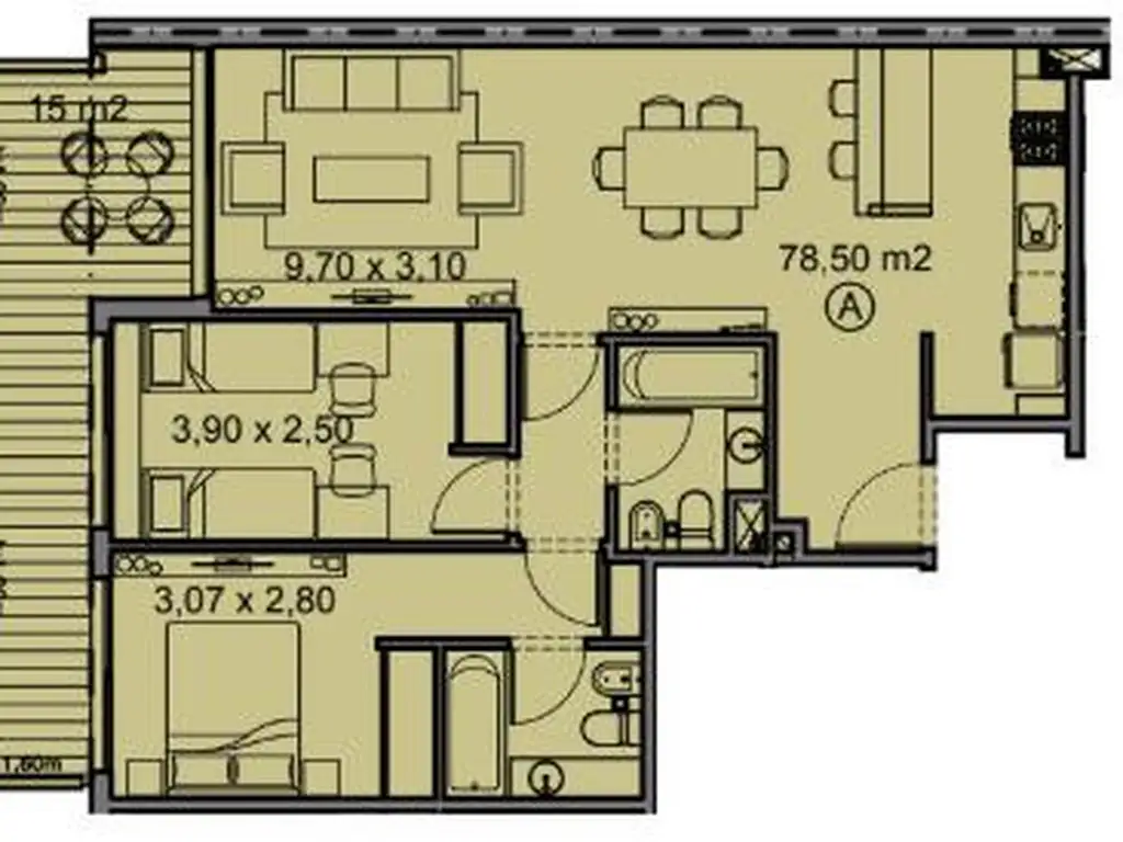 La unidad cuenta con un living-comedor con cocina integrada, un dormitorio principal en suite con vestidor, segundo cuarto y otro baño completo.