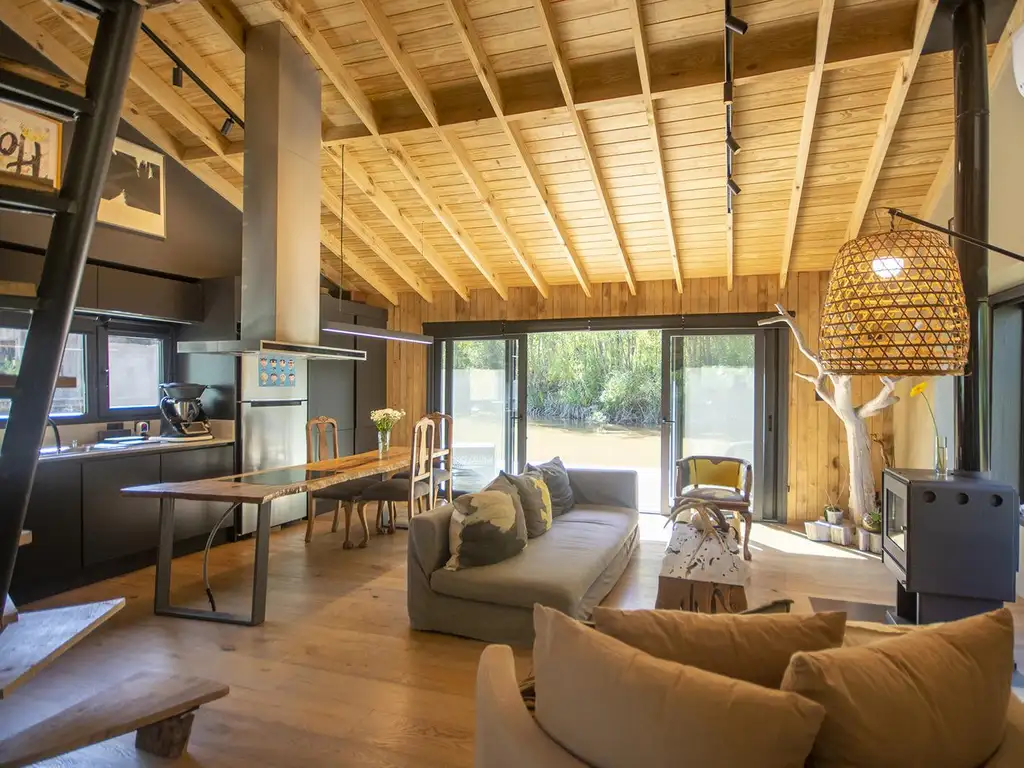La casa cuenta con un living comedor con cocina integrada con mesa de madera en la que se encuentra empotrado el anafe eléctrico. Horno empotrado eléctrico.