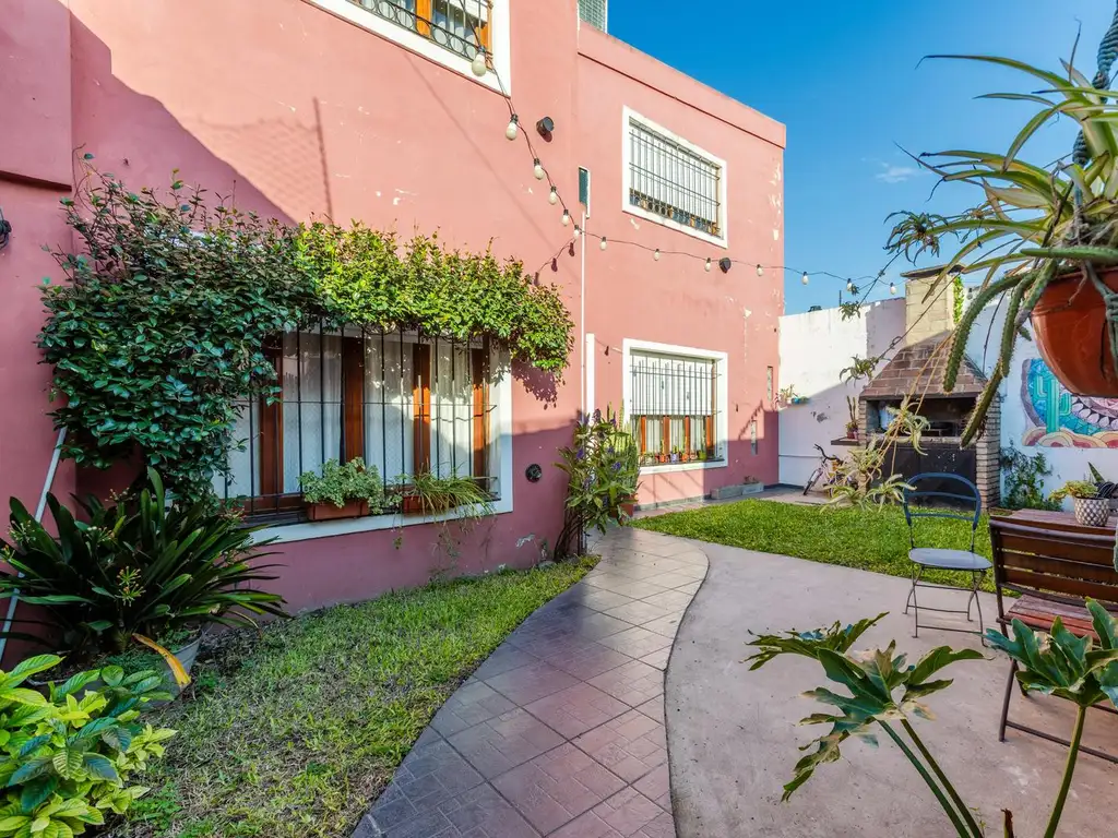 Ingreso por pasillo a un patio frontal con asador y jardin.