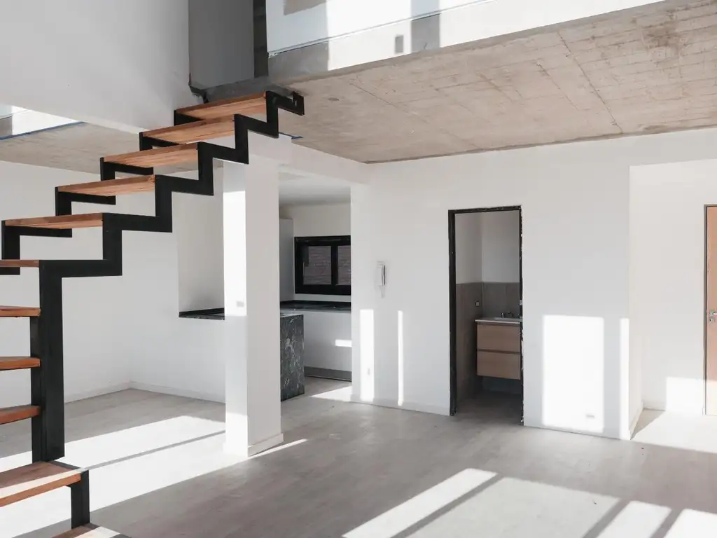Departamento Dúplex de 2 dormitorio con 1 baños y un toilette y balcón al frente Norte, piso exclusivo. La construcción es moderna con pisos flotantes de primera calidad, zócalos colocados, cocina con alacenas y bajo mesada en melamina blanca con mesada de granito y bacha simple. Espacio técnico para heladera, microondas y purificador. Anafe de vitrocerámica, termo tanque eléctrico y espacio técnico para lavarropas. Baños completos con revestimiento completo en porcelanato, grifería y sanitarios de primera calidad, receptáculo de ducha y vanitory, ventilación natural. Buena calidad de aberturas en aluminio negro con DVH. Toma a altura para colocación de A/A.