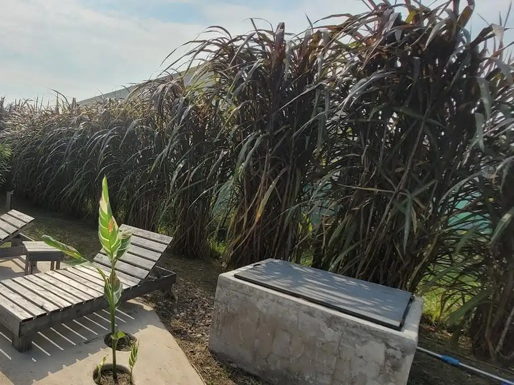 En su exterior cuenta con Jardín generoso en sus dimensiones, Pileta de 4x8 construida con resina importada de España. Galería con Parrilla. Horno de Barro (la Pileta cuenta con pozo de agua sólo para ese uso). Su Orientación del Frente al Oeste le otorga sol por la tarde y todo el día, en la Pileta