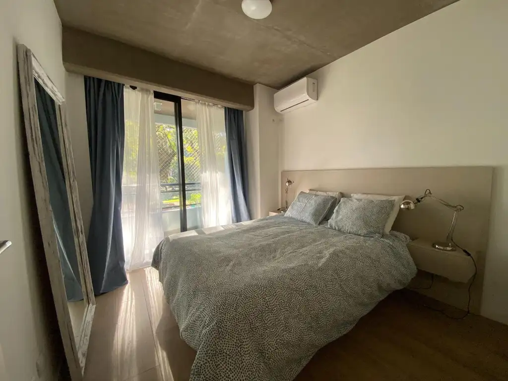 El departamento es muy luminoso. Tiene Living comedor con salida a balón. Cocina integrada de líneas modernas, que incluye un anafe vitrocerámico de 2 zonas y un horno eléctrico. El dormitorio tiene salida a un balcón corrido, y el ambiente está equipado con aire acondicionado frío/calor. El baño con ducha.