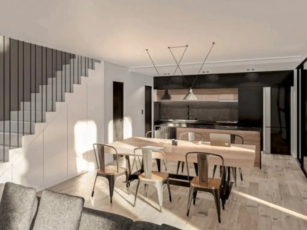 Planta baja: living-comedor con cocina integrada, 1 dormitorio con antebaño y baño, patio-cochera.