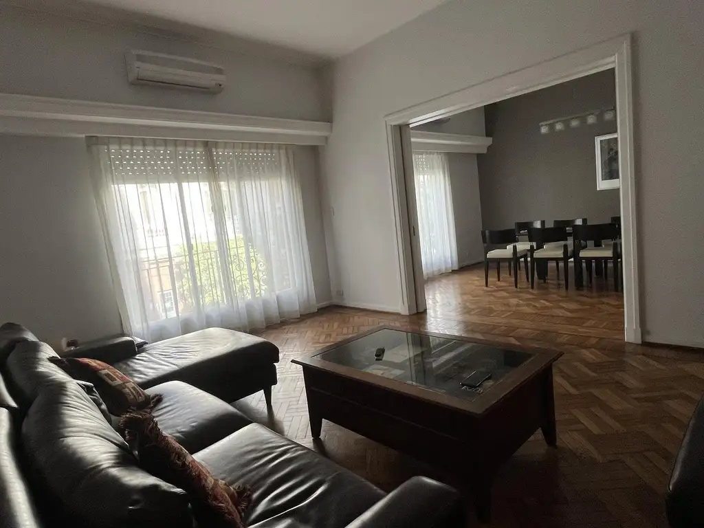 Pasando por un hall de acceso de 4.60 x 2.50, llegamos al living de 6.00 x 4.00 m2, totalmente separado mediante una arcada de un comedor de 5.00 x 4.00 m2, con ventanales respectivos para cada ambiente que dan a un balcón corrido al frente sobre la calle Olaya.