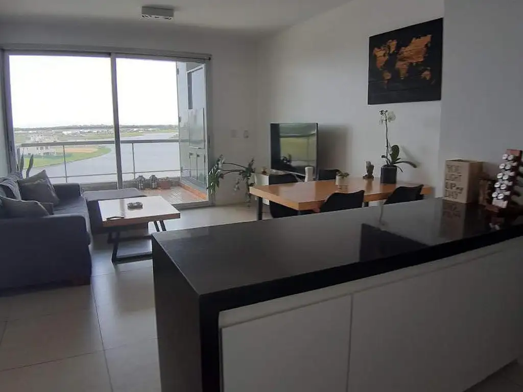 Living comedor con cocina integrada y salida al balcón aterrazado con parrilla. Toilette. Suite con vista al lago central.