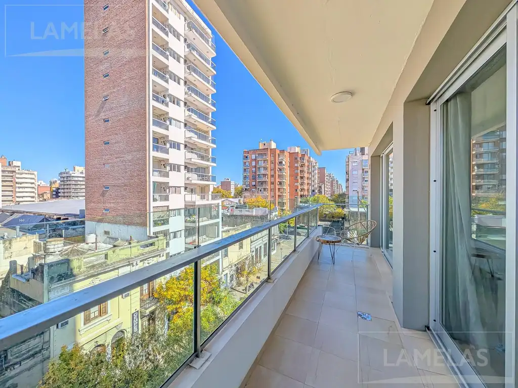 La unidad se encuentra en el primer piso al frente. Posee un amplio y luminoso living comedor con cocina semi integrada, lavadero independiente y grandes ventanales con salida al balcón corrido. Cuenta con dos dormitorios, siendo el principal en suite con vestidor, y un segundo baño completo.