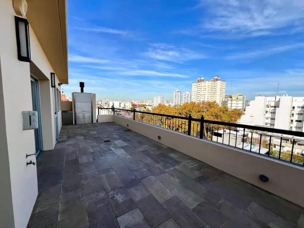 Amplia cocina completa con salida al balcón aterrazado de 50 m2 con parrilla y ducha en un piso alto con vista a todo el barrio.