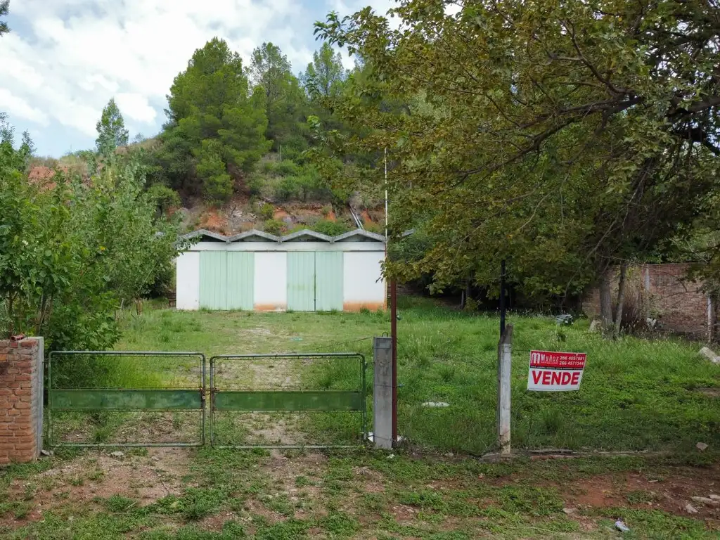 El terreno cuenta con un galpón color blanco con puertas verdes y un alambrado en el frente con portón