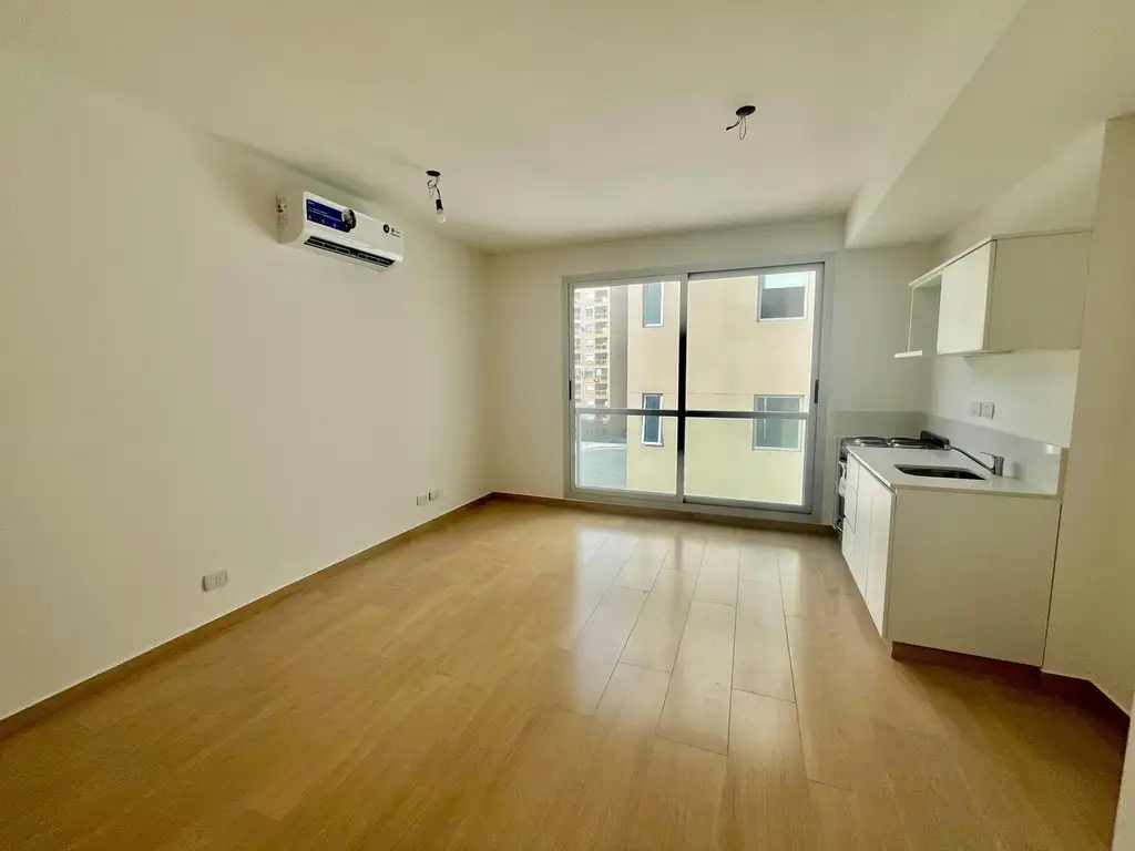 Ambiente luminoso con placard con frente e interiores completos. Cocina americana equipada con muebles bajo mesada y alacenas. Baño completo. Aire acondicionado tipo Split Frío/Calor instalado. Pisos de porcelanato de alta calidad. Acceso al edificio mediante sistema electrónico con Face ID.