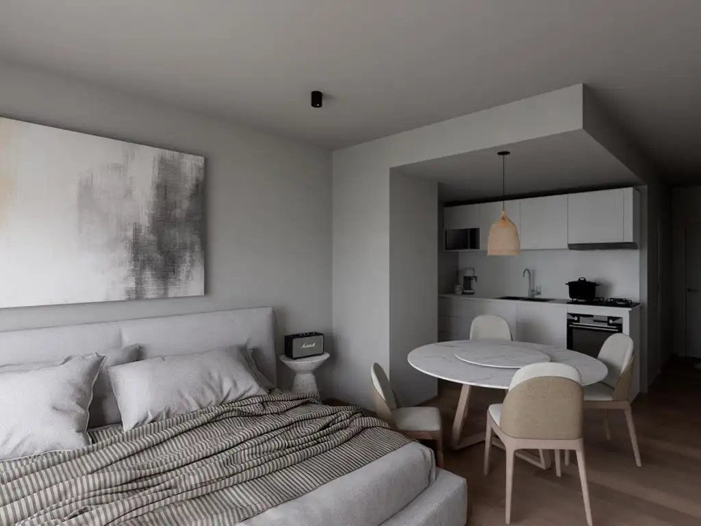 _ El mismo posee cocina equipada con muebles sobre y bajo mesada integrada al espacio principal con múltiples espacios de guardado empotrados y un baño completo. Amplio y luminoso, cuenta con balcón y pre instalación equipo de aire acondicionado.