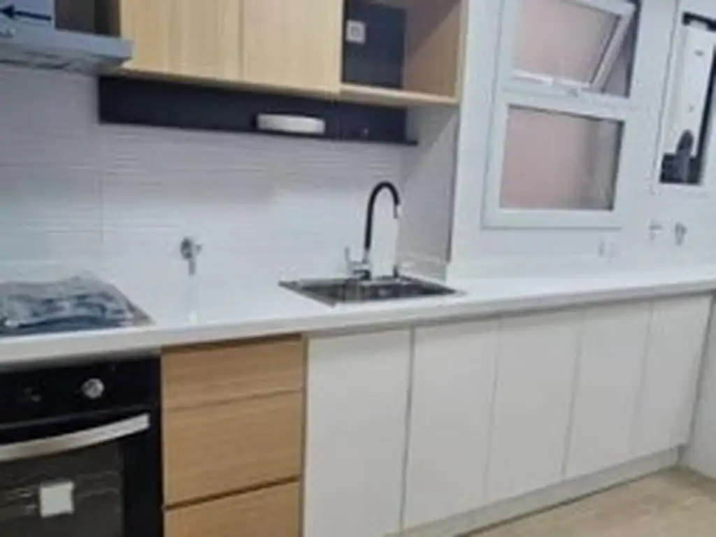 Cocina con horno eléctrico, anafe de 4 hornallas a gas, calefón y campana purificadora, todos nuevos a estrenar. Espacio para el lavarropas y heladera. Mesada de Silestone. Agua caliente por calefón. Todos los artefacto de la cocina son nuevos a estrenar.