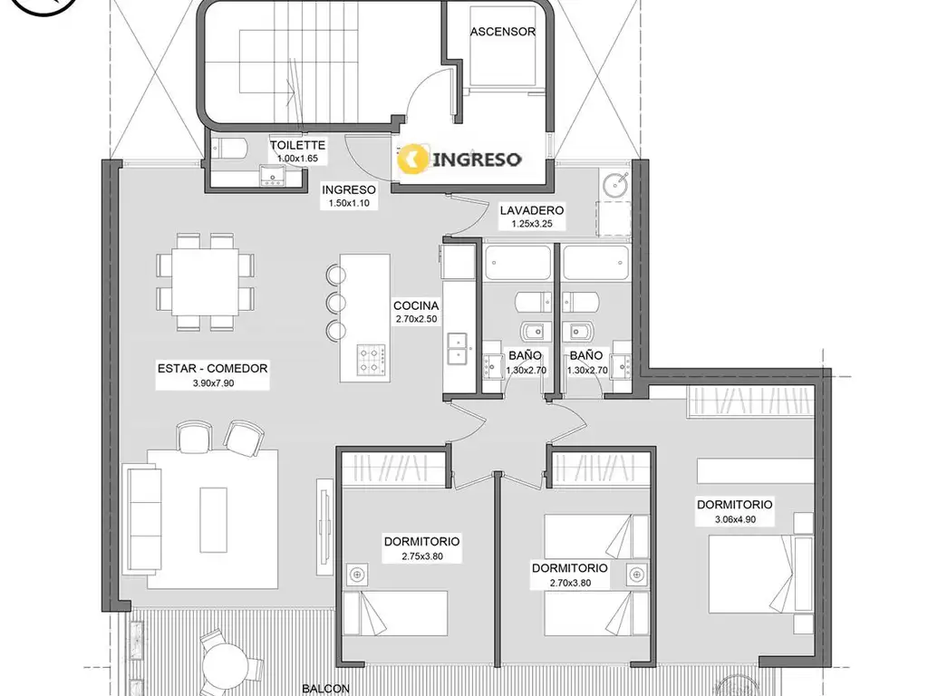 Piso exclusivo con íIngreso a estar comedor con cocina integrada en isla y salida al balcón corrido sobre calle Italia. Toilette. Master suite con vestidor y salida al voladizo al frente. Dos dormitorios secundarios asistidos por baño completo, uno de ellos con salida al balcón.