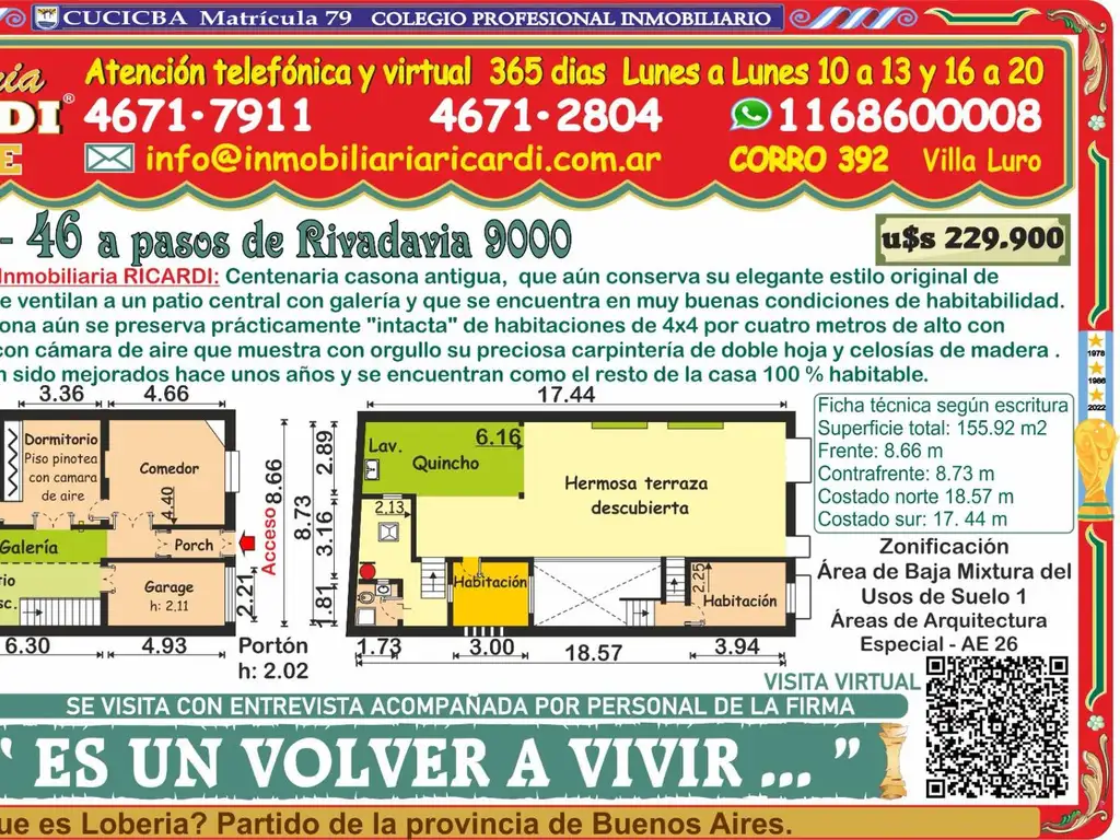La Inmobiliaria RICARDI NO garantiza que el inmueble cumpla con el certificado de conservación de fachadas y balcones (Ley 257) tampoco efectúa el estudio de títulos, ni analiza los alcances del Código de edificación y no será responsable por los vicios ocultos o redhibitorios que competen a quien corresponda. Advertimos al adquirente que las instalaciones eléctricas, de gas natural y-o sanitarias pueden NO solo no tener un correcto y adecuado funcionamiento técnico sino que además puede NO cumplir con las exigencias actuales de METROGAS- EDESUR- EDENOR - siendo a cargo del adquirente que implique su puesta en valor y-o funcionamiento.