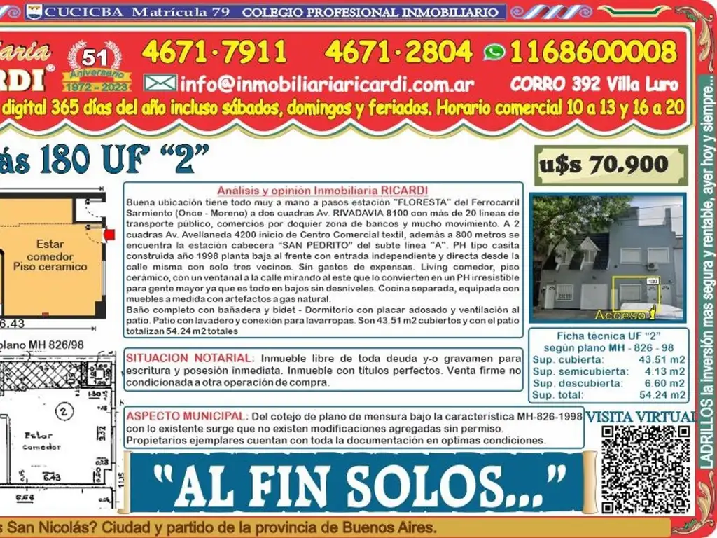 La Inmobiliaria RICARDI NO garantiza que el inmueble cumpla con el certificado de conservación de fachadas y balcones (Ley 257) tampoco efectúa el estudio de títulos, ni analiza los alcances del Código de edificación y no será responsable por los vicios ocultos o redhibitorios que competen a quien corresponda. Advertimos al adquirente que las instalaciones eléctricas, de gas natural y-o sanitarias pueden NO solo no tener un correcto y adecuado funcionamiento técnico sino que además puede NO cumplir con las exigencias actuales de METROGAS- EDESUR- EDENOR - siendo a cargo del adquirente que implique su puesta en valor y-o funcionamiento.