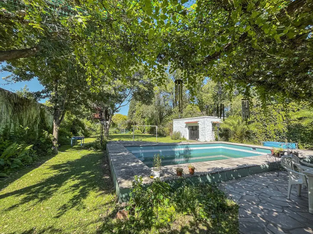 El sector de servicio incluye lavadero independiente, dependencia, patio íntimo y baño toilette compartimentado con duchador. El exterior ofrece un extenso jardín forestado con vegetación consolidada, piscina con bomba y filtro, galería con pérgola y enredadera, generando un entorno verde perfecto para el descanso y la recreación.