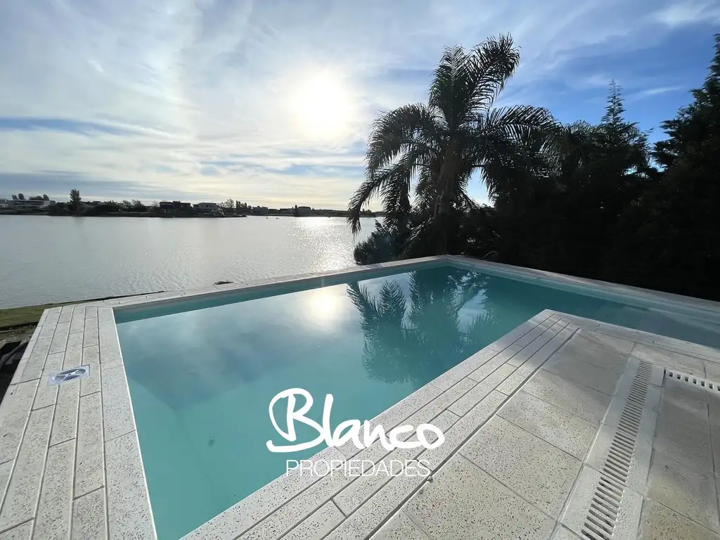 Exterior: Galería con toldos eléctricos y parrilla. Gran pileta en L con 13 metros de largo, climatizable con calentador a gas. Espectacular jardín con salida directa a laguna. Doble cochera.