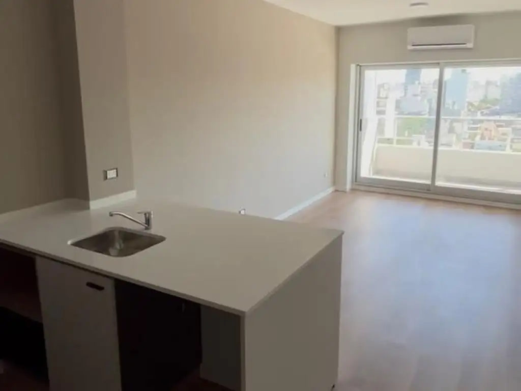 Livingcomedor con cocina integrada equipada con anafe y horno eléctrico, espacio para lavarropas y salida al balcón.