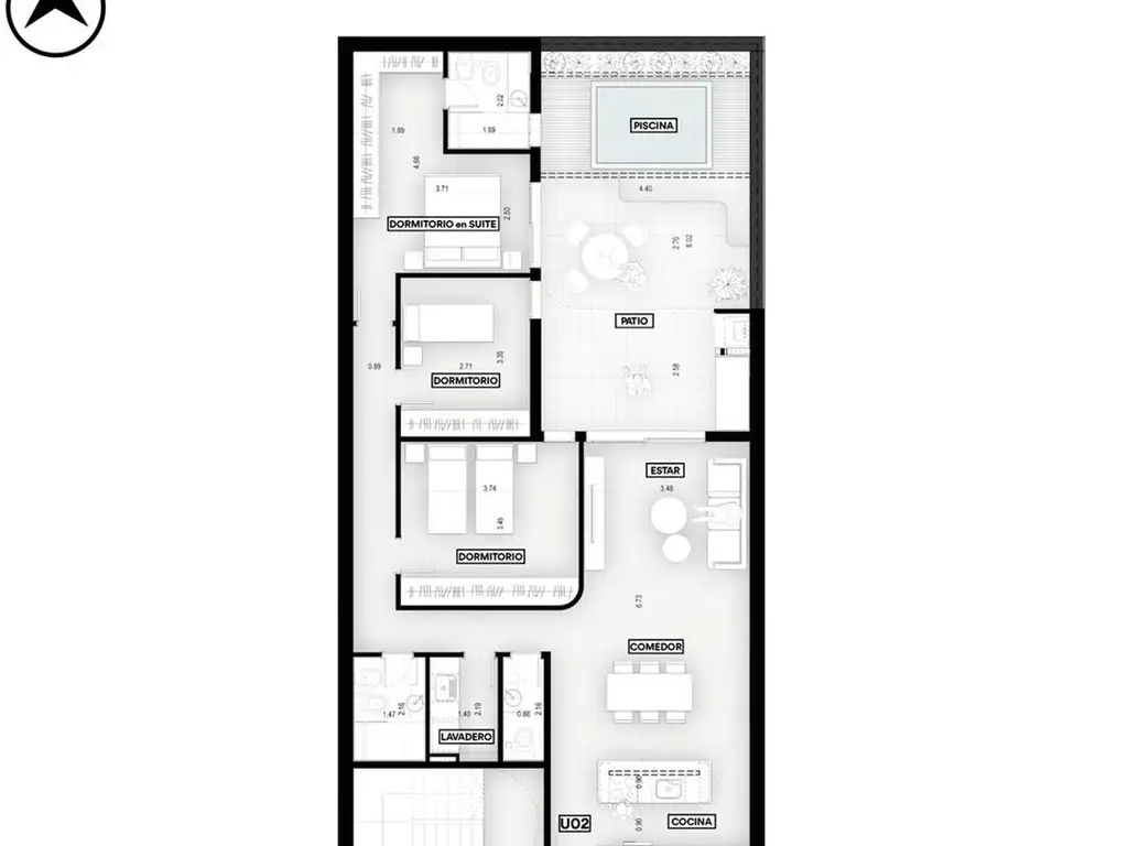 Patio exclusivo con piscina y dormitorio principal en suite.