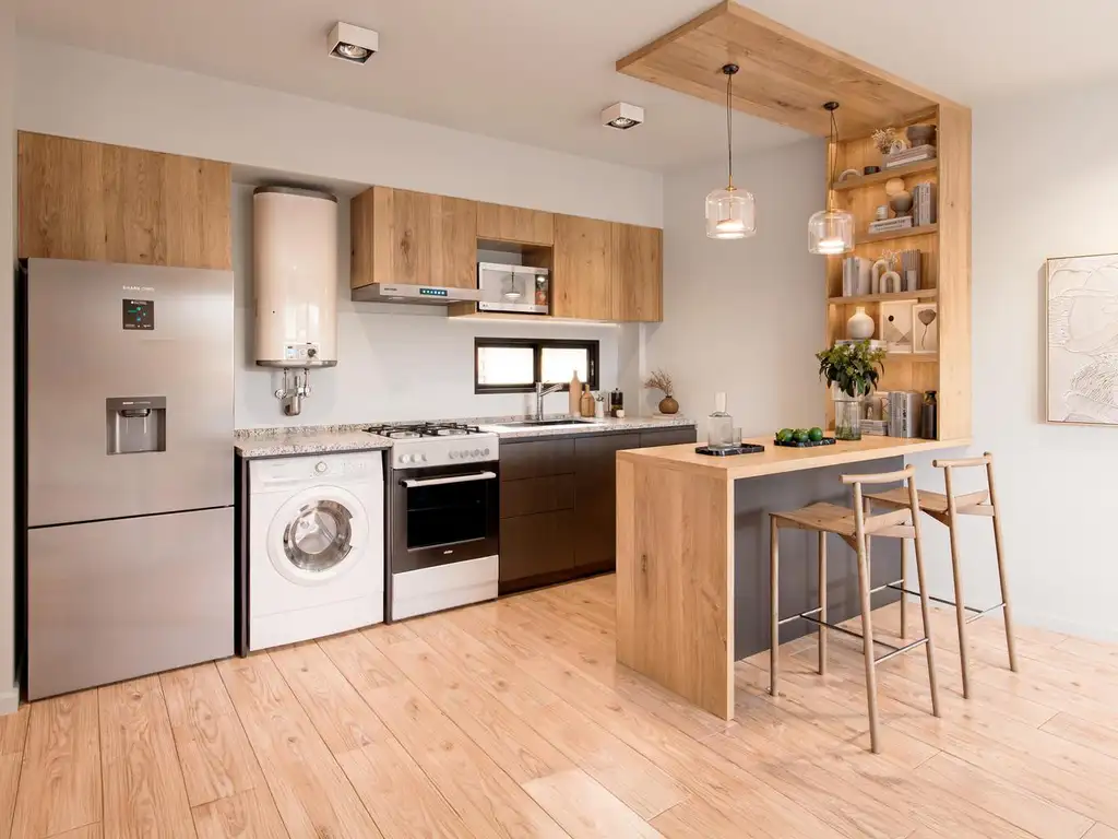 Un dormitorio al frente con orientacion norte y ventilacion cruzada en primer piso. Cocina semi-integrada con barra desayunadora hacia living comedor, cocina 4 hornallas con horno visor y calefon, preinstalacion de aire acondicionado y conexion para lavarropas.