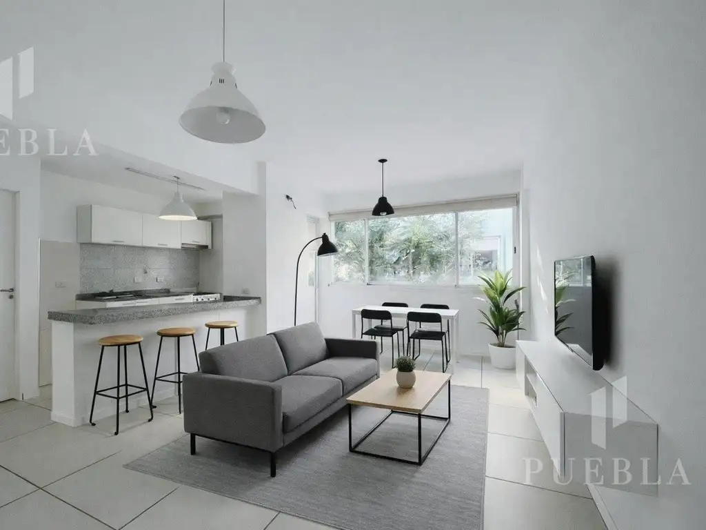 Cocina comedor integrada con amoblamiento sobre y bajo mesada, conexión para lavarropas y barra desayunadora. Living con vista al balcón todo integrado.