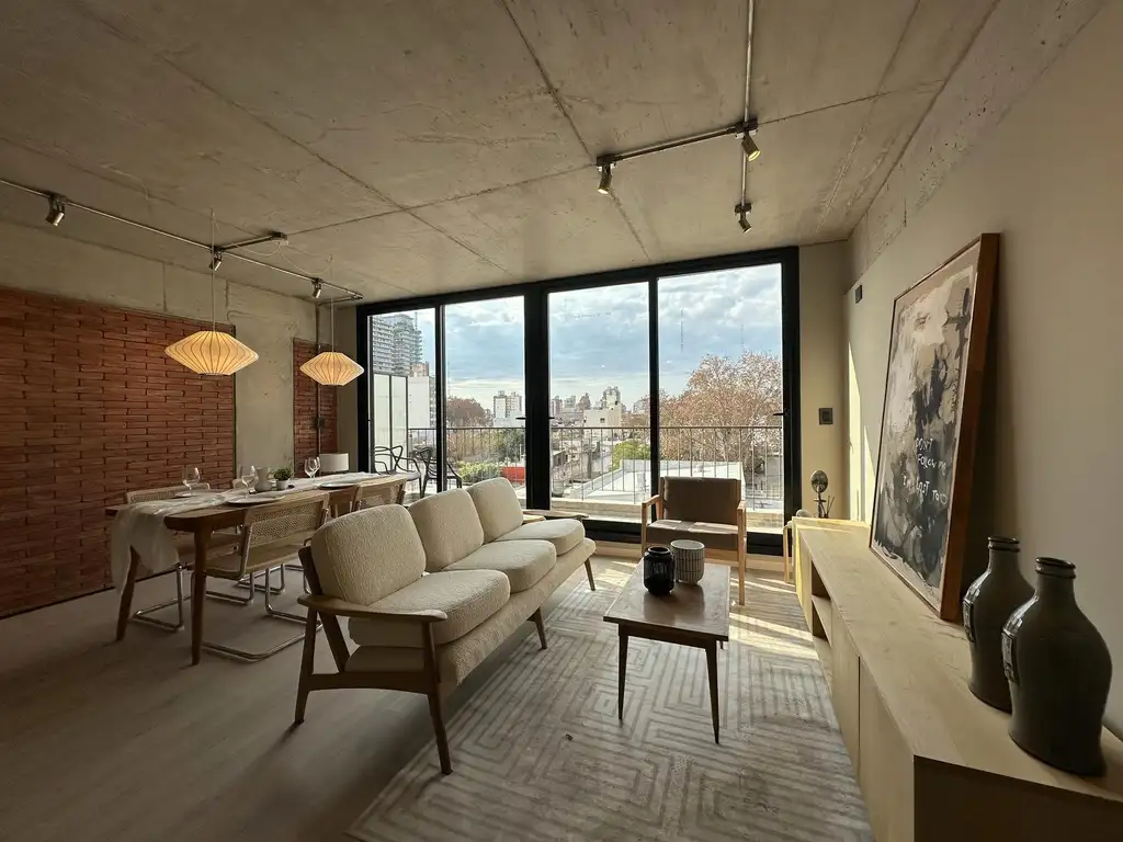 Departamento de diseño de vanguardia, disruptivo de las construcciones tradicionales, con distribuciones de plantas perfectas y grandes ambientes sociales con desarrollo de cocina en isla, con mobiliarios completos ocultos para electrodomesticos panelables, living comedor sectorizado con ventanales amplios y salida a un balcon orientado al este. Intimo compuestos por suite con baño completo, habitacion secundaria + un segundo baño.
