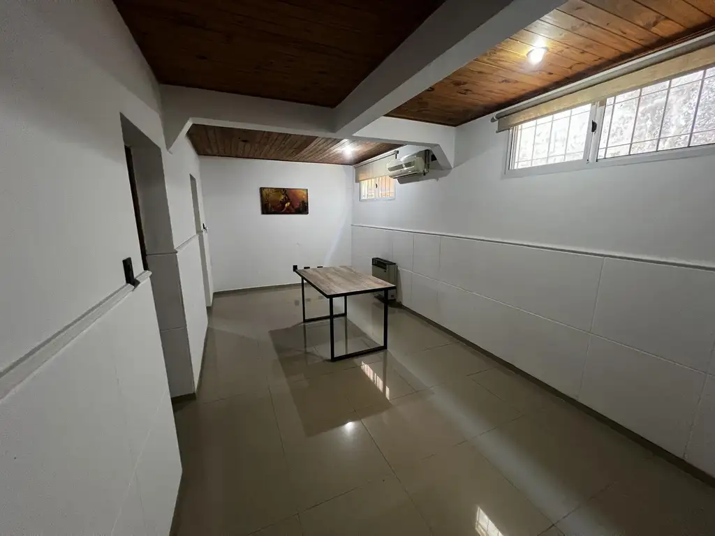 La propiedad fue originalmente construida alrededor de 1968 y fue completamente refaccionada en el año 2011, combinando detalles clásicos con comodidades modernas. El interior se organiza en un living amplio y luminoso con pisos de pinotea reciclada, que se integra con un comedor revestido en porcelanato. La cocina es funcional y cuenta con conexión a un lavadero independiente, además de un patio de invierno que en la actualidad se utiliza como vestidor o espacio de usos múltiples.