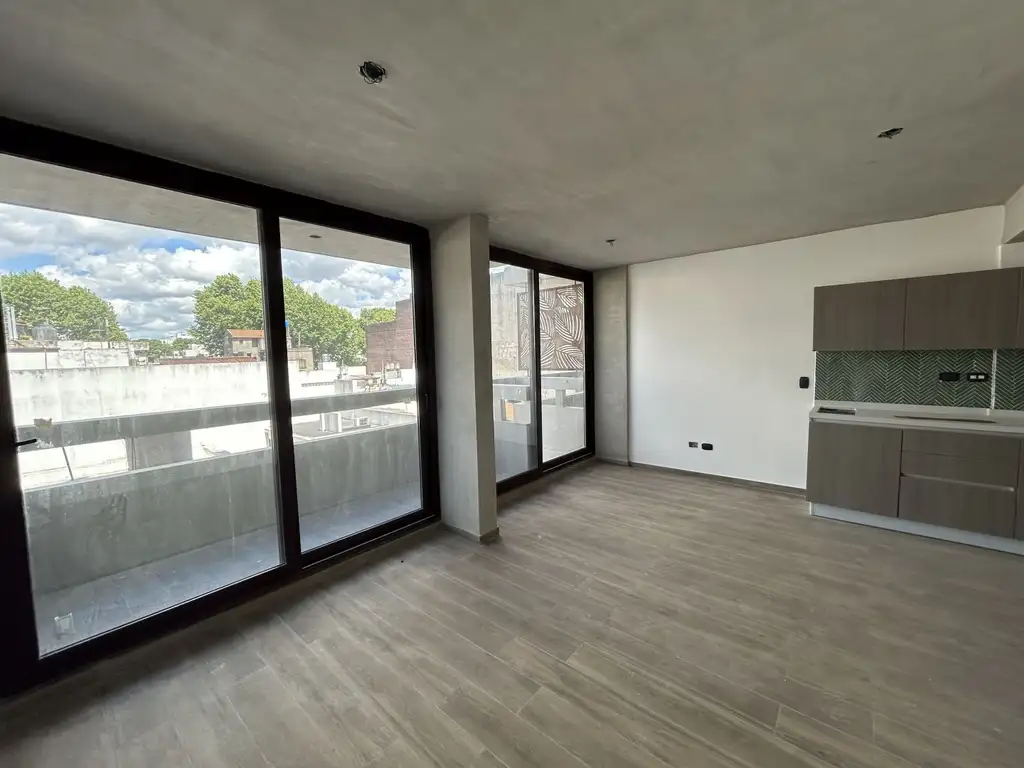 Amplio ambiente luminoso divisible con balcón. La cocina es semi integrada con equipamiento bajo y sobre mesada, piletas de acero inoxidable y anafe eléctrico de dos hornallas. La unidad se entrega con pisos de porcelanato símil madera, carpinterías de PVC con DVH, equipo Split frio/calor y equipamiento sanitario de primera calidad.