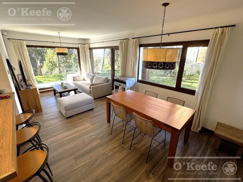 Cuenta con una cocina, amplio living-comedor, toilette de recepción y un placard de grandes dimensiones para espacio de guardado. Dispone de dos dormitorios en suite, ambos con placard y vistas al cerro Otto. Cuenta con un hermoso jardín propio.