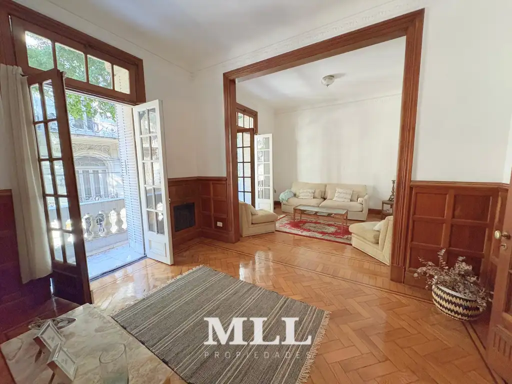 Palier privado. Hall, 4 Ambientes al frente que se comunican por puertas de vidrio repartido (living doble, comedor y escritorio). 3 Dormitorios. Toilette de recepción y 2 Baños, uno compartimentado. Cocina. Dependencia y baño de servicio. Lavadero.