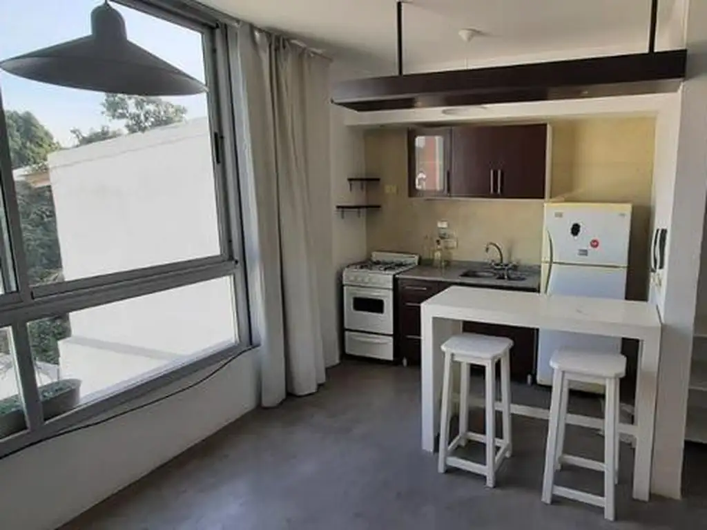 Amplio y luminoso monoambiente. Cuenta con cocina integrada, amueblada y heladera , con barra desayunadora, lugar de guardado y baño completo con bañera.