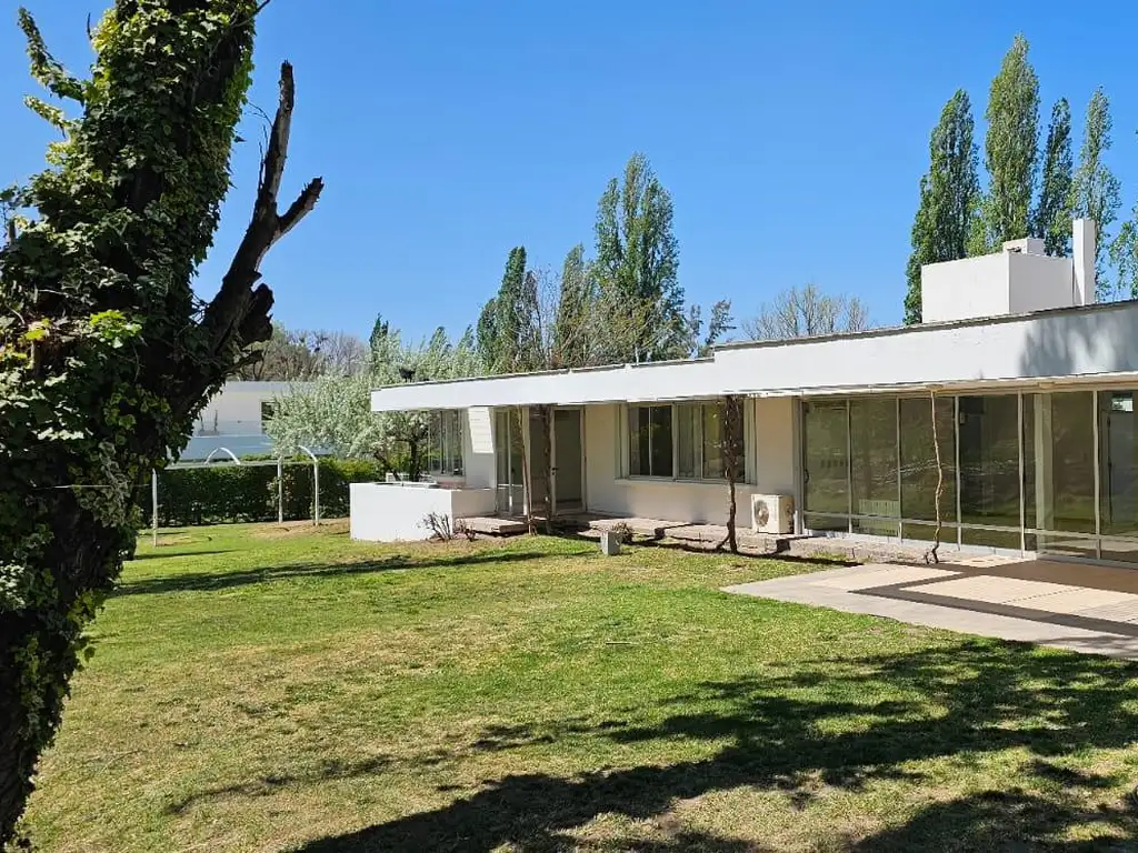 El proyecto arquitectónico donde predomina el blanco las líneas puras y horizontales representadas por grandes losas sin vigas de dintel, aberturas en aluminio dolbre vidrio, pisos y revestimientos cerámicos, amoblamientos y placares en melanina. Calefacción por radiantes, riego por aspersión, cisternas. Estado general del inmueble impecable, no hay que hacerle nada está super cuidada, pintada impejorables condiciones.