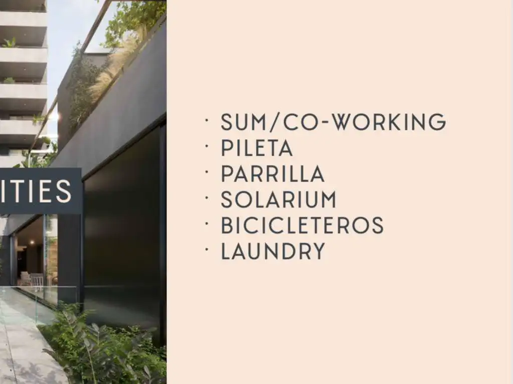 El emprendimiento cuenta con exclusivos amenities como SUM, pileta, parrilla, área de solarium, espacio de bicicleteros y laundry. Para que puedas vivir y disfrutar como te mereces.
