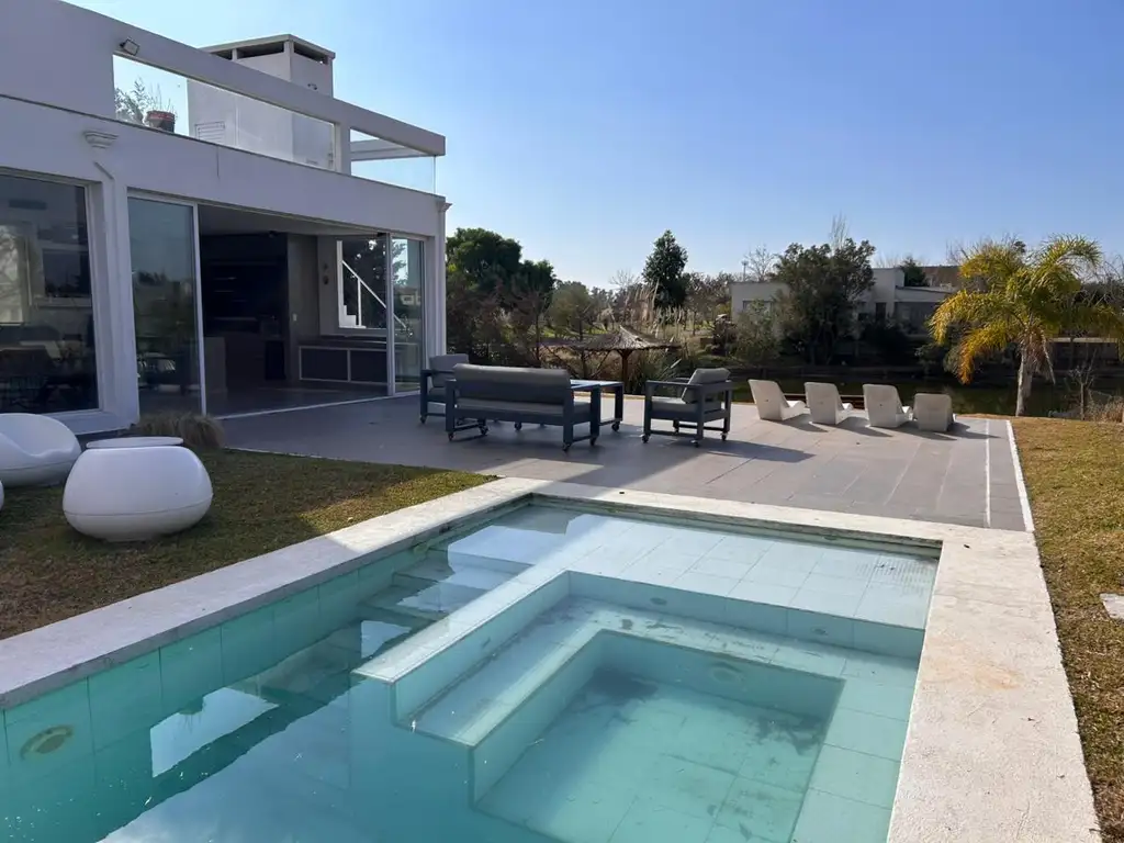 Quincho integrado: gran ambiente vidriado, comunicado a la cocina y al parque, con vista a la laguna.