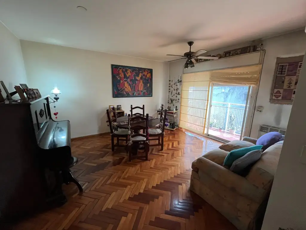 Living comedor con balcon piso de parquet en muy buenas condiciones. Con estufa a gas y aire acondicionado split F/C