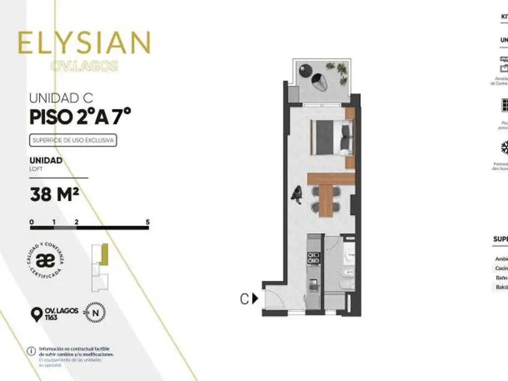 Descripción: Monoambiente en edificio en construcción. La unidad cuenta, cocina integrada, estar-comedor y balcón. El edificio ofrece espacios compartidos: SUM con parrilla, solarium, living exterior con fogón, bicicletero, espacio para motos y cocheras. Seguridad incluida.