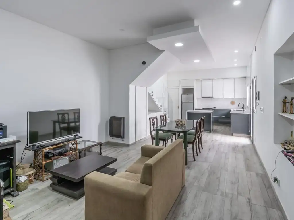 Planta Baja: Ingreso por living comedor, cocina integrada con isla., un dormitorio con baño. Ingreso al galpón.