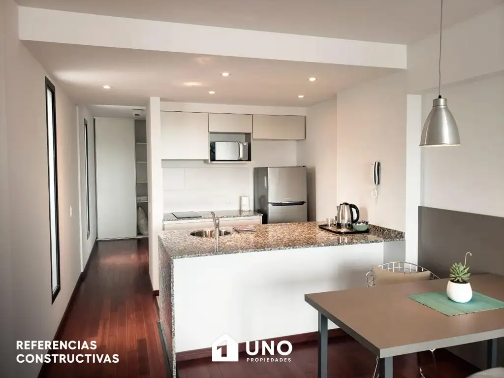 Departamento con entrega en Agosto de 2028. Ambiente único con la cocina equipada, desayunador, espacio de guardado y baño.